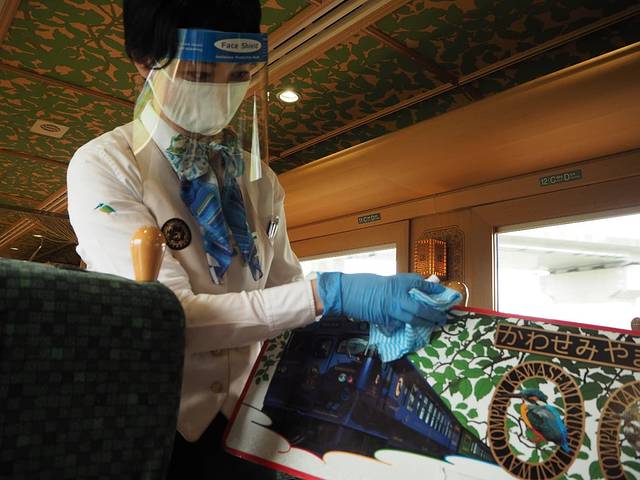 日本的很多交通设施都采取了勤消毒、避免封闭空间等安全措施。JR九州作为公共交通运营单位,也采取措施对乘客进出的场所进行消毒,并避免面对面的飞沫传播。