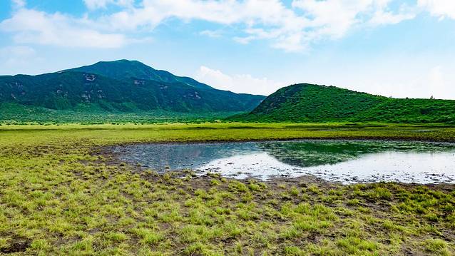 一望无垠的大草原在乌帽子山的北麓忽地铺开,巨大的池塘、自由自在的马儿描绘着惬意的自然牧歌。绿色鲜艳的炎夏、或是银装素裹的冬日,四季的风景各有看头。骑上马背在丛中驰骋,不远处的中岳山时而喷出一缕青烟,独特的自然体验令人难忘。