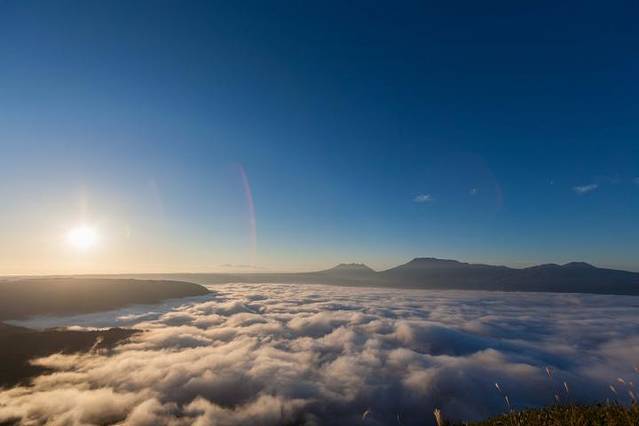 阿苏的街道、阿苏五岳、九重连峰都可以一览无余。从这个角度观赏,阿苏五岳看起来就像熟睡的释迦牟尼,因此被称为“涅盘像”。秋冬时节会出现云海,与连绵的山脉一起构成令人惊叹的神奇美景。