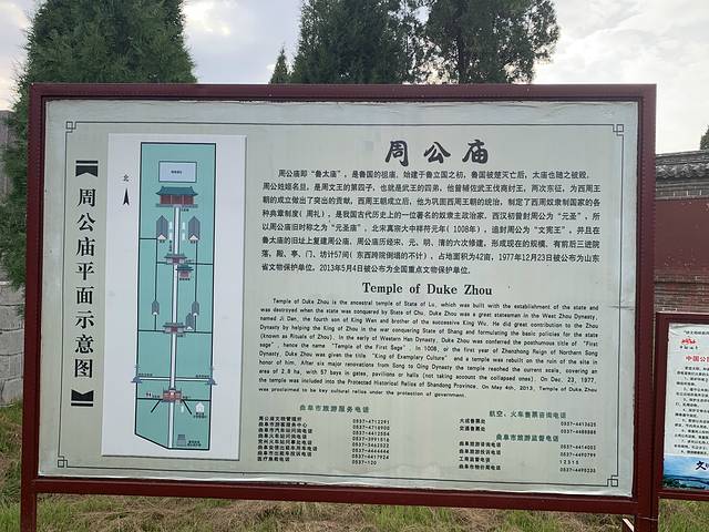 周公庙在曲阜城的东北隅,离孔庙约千米之遥,是为纪念西周政治家周公的庙宇,因古代帝王曾封周公为元圣,故亦称元圣庙。 周公庙历经宋、金、元、明、清历代6次增修扩建,形成了现在的规模。庙庭总面积达75亩,四周红墙环绕,内分四进院落,有殿、堂、庑、亭、门、坊57间,历代古碑30余幢,有桧、柏、楷、槐等古树名木,交织庇荫,蔚然壮观。
