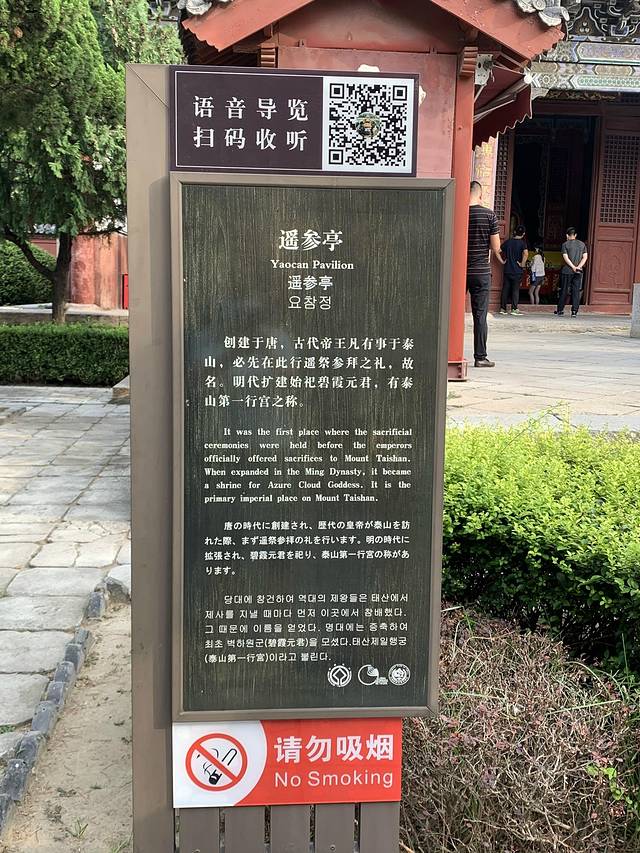 “参拜泰山神,先拜遥参门”。遥参亭是岱庙建筑群南北轴线上的第一组建筑,自此向北直抵泰顶的南天门,其建筑独立但与岱庙在内涵上又统一,堪称岱庙前庭。古代帝王每逢来泰山举行祭典,都要先在这里举行简单的参拜仪式,以示对泰山神的虔诚,因此又称“草参亭”,后来因为草似乎不敬而改为遥。自明以来一直供奉碧霞元君,由于香火兴盛,以至民间将其称为“泰山第一行宫”。