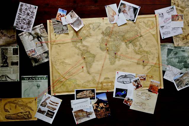 接着,我们再去考古营地。墙面上有一张世界地图,贴着世界各地有关恐龙的信息。这里还有一些掩埋的沙石,可以看得见是被挖掘出来的化石。旁边还设有VR化石识别仪,能够让人更清晰的看到化石背后的生命信息。