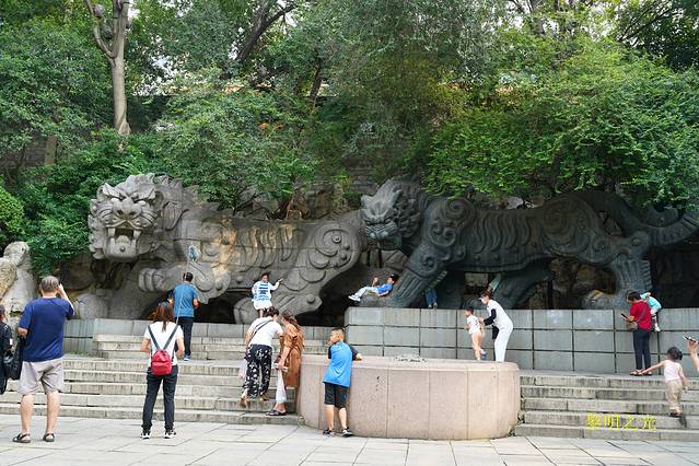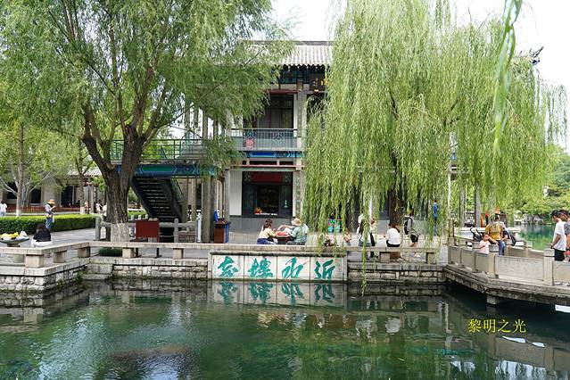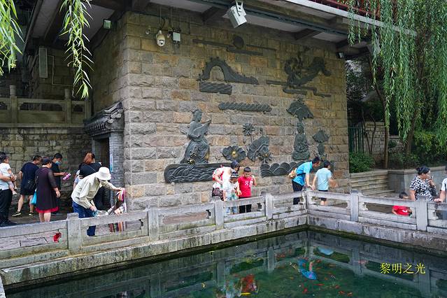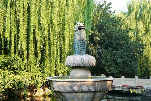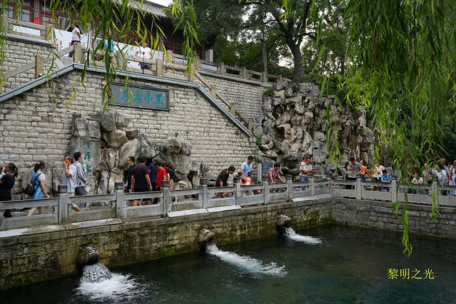黑虎泉四周,垂柳依依,泉水从三个石雕虎头中喷射而出,流入方形泉池内,池内的泉水清澈,青藻漂浮,之后再流入护城河。在泉源的东侧有两只一铜一石的巨虎,引首奋蹄,呈猛虎下山之势,看起来很威猛。今天人很多,我们随人流漫步在护城河边,来回观赏了一虎泉、豆芽泉、琵琶泉、白石泉、九女泉等许多小泉。看到黑虎泉附近有许多扫码免费取水点,也有一直流淌泉水的龙头,济南本地人带着大桶小桶来接水,我们也用饮料瓶子接了点感受了一下,确实比较好喝,有点甘甜的感觉。坐在护城河边,喝着甘甜的泉水,看着轻拂的杨柳、潺潺的流水、撒欢的鱼儿、嬉戏的孩童,细语的情人,感觉气氛一派祥和欢乐,幸福满满。
