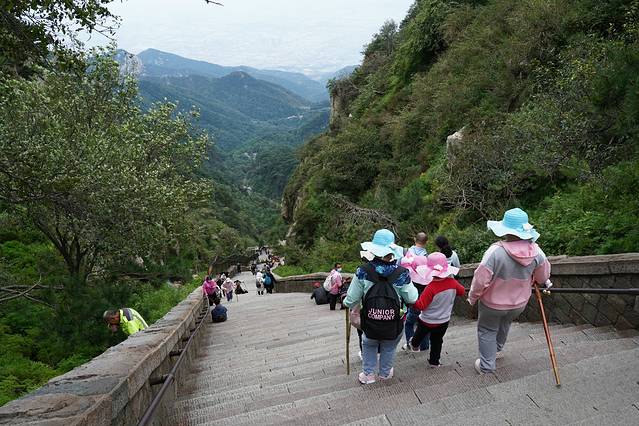 8:40离开宾馆,从南天门步行下山。十八盘从上面看十分陡峭,沿着石台阶缓缓向下,还是有点心惊,好在下山不那么费劲,经过昇仙坊、龙门后,山路越来越缓,感觉得越来越好走。回过头来仰望泰山,巍峨、雄伟、险峻,不愧为“天下第一名山”之称!过对松亭、望人松、雲步桥、迎天,10:20到达中天门。