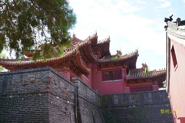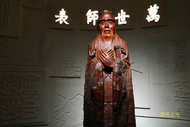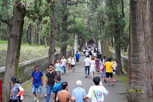 穿过城墙,经过验票、安检,才进入了孔庙。首先看到的石坊叫金声玉振,往前,庙墙外东西各立一块石碑,块碑上写“官员人等至此下马”。进入第一道牌门“棂星门”后向里望去,只见门洞层层深不见底。接着会依次穿过圣时门、弘道门、大中门、同文门,各道门之间都是草木葱郁的院落。其中,大中门左右两边靠墙角处各有一座角楼,而同文门左右两侧各有两座大石碑,之后的高大建筑是奎文阁,过了奎文阁可看到十三座碑亭,有许多碑刻,内容多为历代帝王修庙祭庙的记录。再往前走是大成门,孔庙在这里起分为三路布局,中为大成门,左边是金声门,右边是玉振门,再往西为启圣门,再往东为承圣门。大成门与邻近碑亭之间是飞檐交错的建筑设计。大成门三字系雍正皇帝的御笔。过了大成门有一座亭台名为杏坛,是孔子后代为纪念孔子讲学所建。继而来到孔庙的主殿--大成殿,大成殿四周环有28根用石头雕成的龙柱,栩栩如生。殿内高悬康熙帝手书“万世师表”、光绪帝手书“斯文在兹”等匾额。大成殿是孔庙的主殿及标志性建筑,它和北京故宫的太和殿、泰安岱庙的天贶殿并称“东方三大殿”。殿正中供奉着孔子的塑像,七十二弟子及儒家的历代先贤塑像分侍左右,据介绍历代皇帝的重大祭孔活动就在大殿里举行。走在孔庙,周围全是各种的牌坊、碑亭、阁楼、房屋和大殿古香古色、雕梁画栋或龙或狮或珍禽异兽,园内古树参天、苍柏奇松,那种年代的沉淀和历史的痕迹都让我们瞬间有种穿越的感觉,很庄重!
