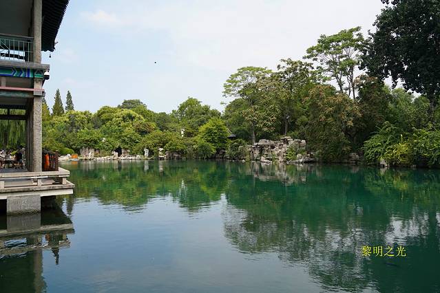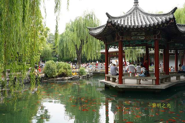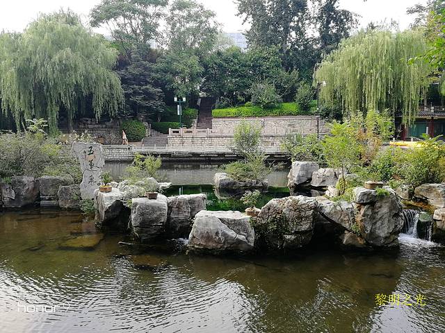 五龙潭公园与著名的趵突泉景区仅一街之隔,公园内的五龙潭与趵突泉、黑虎泉、珍珠泉并称“济南四大名泉”,园内还有二十七处小泉。五龙潭公园是免费的,进入五龙潭,我们首先看见的是一块九龙壁,继续前行,公园内树木繁多,枝繁叶茂,五龙潭清澈碧绿,玉泉、濂泉、月牙泉等许多小泉遍布园内,泉水清冽甘甜,环境十分优美,到达北面是一组唐代风格的建筑,据说曾为秦琼故宅。折回漫步在垂柳环绕,小溪潺潺,曲桥亭台,有成群的假山石的公园中,感觉十分悠闲。坐在低矮的假山石上观泉、或坐在潭边石栏上观鱼、或坐在亭台观孩子用水枪在潭边戏水,十分惬意。五龙潭公园不大,沿着曲径小道,又一个来回漫步后,我们基本欣赏了公园的全部景点,14:00从五龙吐水对面公园东门离开。