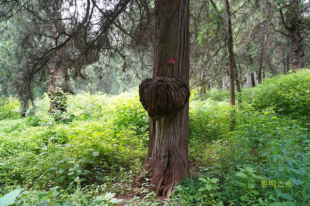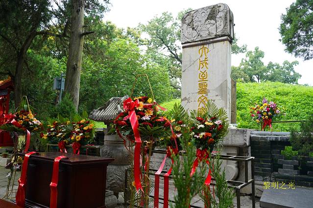 继续前行,就是孔林里最引人注目的“3墓1屋”。3墓呈“品”字形南北结构,中间隔一条供前来祭奠孔子墓的甬道。分别是西边孔子墓,东边的孔鲤墓,南边的孔伋墓。在孔子墓西侧有一座小屋,相传原来是茅草屋,是孔子得意门生子贡为孔子守墓时所住。孔子死后,众弟子为孔子守墓三年,相诀而去,唯子贡哀思未尽,独在此又守三年。后人为纪念此事,在原来茅草房处建屋三间,立碑一座,题为“子贡庐墓处”。我们到达时,看到许多好像是学生模样的人在焚香行礼,我们没有过多的停留,怀着对儒家思想的崇敬之情看过各种古碑和石刻后返回,从乾隆驻跸亭经“远代诸墓望祭之坛”到达中路休息区,穿小路过林区。诺大的孔林,树木苍翠,遮天蔽日,除了树木就是墓碑。林区内听不到任何其他的声音,除了树叶在风中蔌蔌的作响声,就是我们轻轻的脚步声,走入其中无形中给人一种庄重肃穆的感觉。只是希望我的脚步声不会惊扰死者的长眠。出了林区,我们沿右边电瓶车道返回。