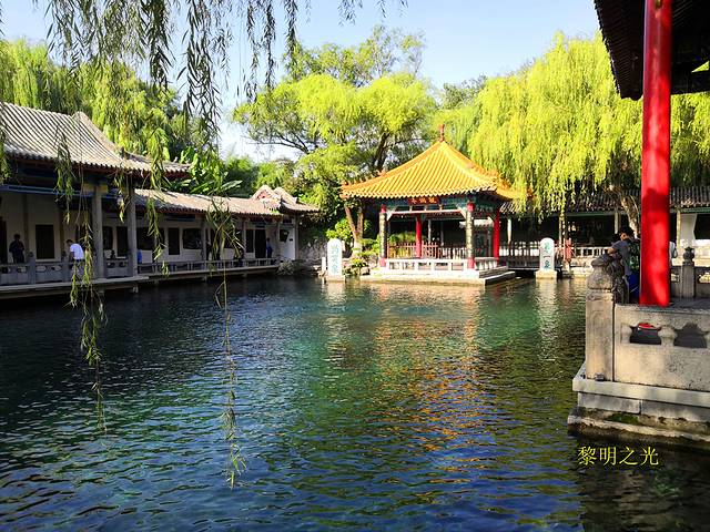 6:30起床,洗漱后,直奔五龙潭公园,从东门进入,做最后的告别游。映入眼帘的是五龙轻轻口吐泉水,好像显得十分的悠闲自在。公园里人比较少,有晨练的老人,带着大桶小桶来取泉水的个别本地人,还有个别品尝泉水、洗脸的人,我们也品尝了清冽的泉水,口感清凉甘甜,抹在眼睛上,感觉爽爽的。公园里十分安静,晨阳慢慢升起,林间小道上花瓣逐渐增多,亭台楼阁一点点露出了面目,泉水缓缓的流动,鱼儿轻轻游荡,仿佛一切都显得那样的安逸,静中有动,但不是大动,动中有静,但也不是静谧,让人感觉十分舒服。我们或在林间小道穿行、或在假山旁看泉水流动、或坐在亭子中观鱼,走走停停,拍人像、拍风景、拍阁楼、拍花草……拍拍拍。喧闹声逐渐增多,好像一切都动起来了,泉水的流速开始加快了,鱼儿也开始撒欢的游起来了,亭台楼阁也揭去面纱,我们也从安逸的享受中回过神来,一看时间,差不多十点了,赶紧返回宾馆,整理好行李,退房。