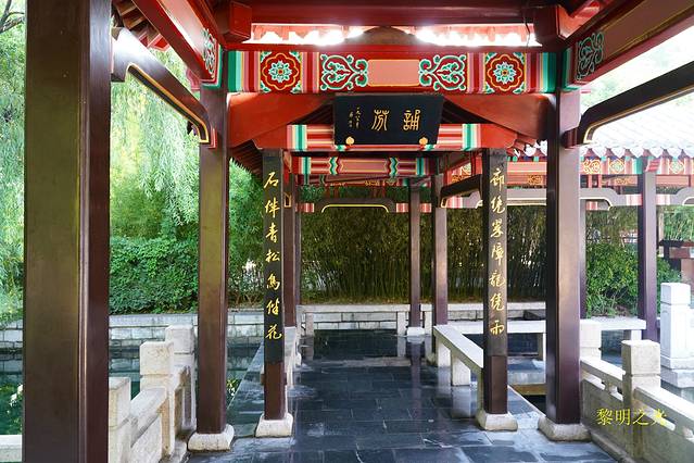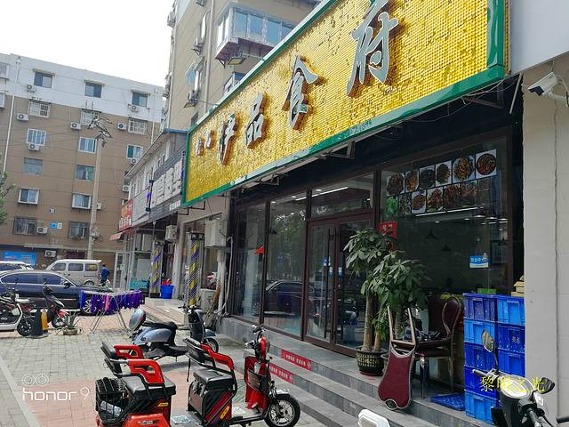 11:00我们从南门离开趵突泉,就近逛了济南回民街,一条不太长的普通街道,两边有许多清真饭馆,主要买羊汤、羊杂和烧饼。我们在伊品食府吃了回锅牛肉、清炒肉松、香芋丸子、烤肉串等。12:30吃完饭,步行不到十分钟就到了五龙潭南大门,一座古香古色的牌坊,闪闪发光。