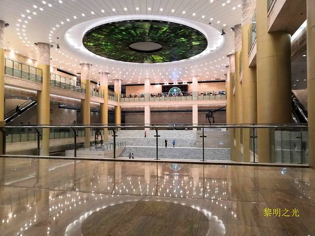 11:00我们刷身份证进入博物馆。博物馆面积很大,装饰的大气敞亮,穹顶设计很漂亮。博物馆共有三层,一层有汉代画像艺术展和佛教造像艺术展两大展区。二层是山东历史文化展、孔子文化大展、馆藏绘画展、馆藏书法展、明代鲁王展几大展区。三层主要有“话说考古”与“考古成果展”两大展区。在山博,可以看到大量的古代陶瓷器、青铜器、书画古籍、甲骨、汉画像石等各种文物。据介绍,大汶口遗址出土的红陶兽形壶、商代的甲骨文、战国时期的鲁国大玉璧、《孙子兵法》和《孙膑兵法》竹简、东平汉墓壁画等均为镇馆之宝。