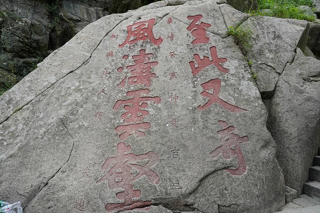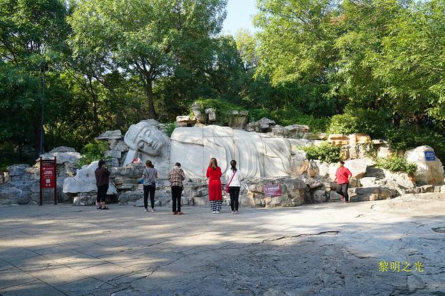 尽兴后,我们前行下山,经过比较难走的最窄的下(登)山台阶,沿着人工在岩石上专门刻出来的石阶缓步下到了望岱亭。此亭寓意可以望见泰山,于亭内极目远眺,山峰重峦叠嶂,有点意思。这一路几乎没人,微风习习、树叶哗哗、脚下踩着岩石、头顶上阳光胡乱的打在身上,眼前风景如画,让人感觉赏心悦目,非常舒服。沿人工修建的台阶继续下行,经过唐槐亭又看到了卧佛。我们没有走原路,而是沿健身步道,穿林间小路,经金银路,从西北门出景区。