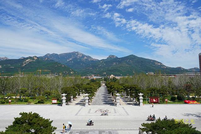 最后,我们登上岱庙北门城楼,站在楼上视野非常开阔,向北望去,广场整洁,一排排青松挺立,树冠造型层叠错落,远处的泰山轮廓清晰,巍峨挺拔,俊俏亮丽,好似一幅涂彩的水墨画,别有一番味道。
