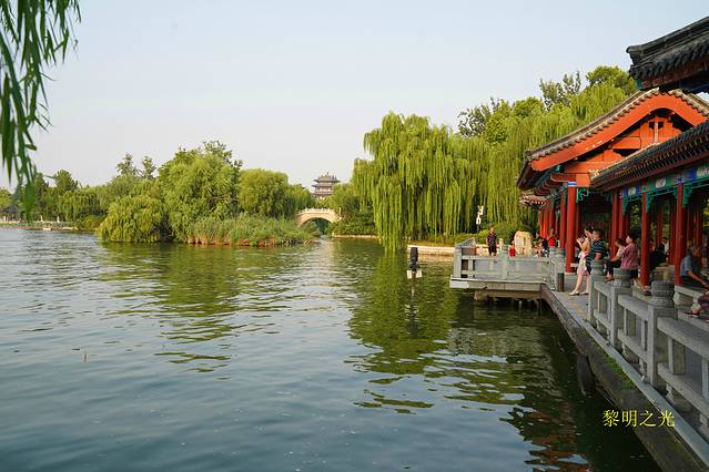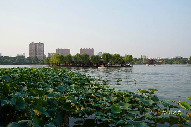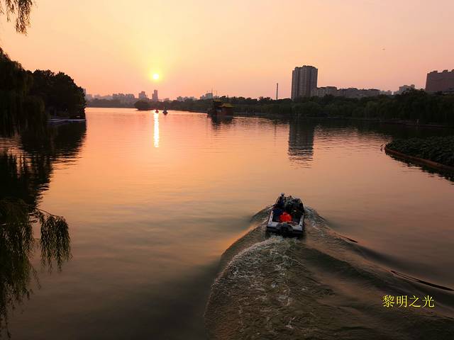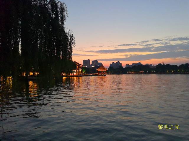 步行十分钟后到达宾馆休息。16:00左右,我们骑共享单车向大明湖进发,七八分钟后从西南门进入,免门票、点赞!大明湖风景区是集水域风光、园林景观、古建筑为一体的公园,被誉为“中国第一泉水湖”,素有“一阁、三园、三楼、四祠、六岛、七桥、十亭”之说,有著名的明湖16景可以欣赏。我们顺时针沿湖边游览,先观看了毛主席诗词影壁,游览了龙泉池,过游乐场、海底世界,观赏了佛山倒影、铁公祠、明湖宝鼎、盆景园、雨荷厅、超然楼,经东南门沿湖边到达南门出景区。大明湖风景真美,岸上翠柳垂荫,婀娜多姿;湖中碧波泛荡,荷花似锦;水面小舟争渡,画舫徐行;更有那纪念古人政绩、行踪的建筑以及观景的很多楼台亭榭,隐现其间;真是百步百景,让人如醉如痴。大明湖畔的夏雨荷最终没有找到,但大明湖里的一朵朵荷花,或粉红如霞,或雪白似玉,亭亭玉立、娇艳欲滴、沁人心扉,好似美颜少女,撑着一把把绿油油的荷叶小伞,在空气中泼洒着满是荷花荷叶的芬芳香气,让人如游香国,让人浮想联翩。夕阳西下了,湖水波光粼粼,杨柳随微风轻轻摇摆,荷花在夕阳轻柔的沐浴之下,显得更加清秀、艳丽、幽洁,水天一色,色美如画。漫步在这样的湖边,观看着这样的景色,才真正对大明湖“三面荷花四面柳,一城山色半城湖”有所理解。