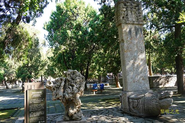 碑碣石刻很多,或在宫殿旁或矗立在树林间,有些已经文字湮灭、面目不全,而驮碑的赑屃(bìxì)虽已肢体残缺,依旧岿然不动、默然坚守,诉说着一个故事或是一段传奇。看着这些的石碑,我们真切地感受到历史的变迁和岁月的无情。先辈们耗费无数的心血和财富,雕刻出的表达泰山神祗敬意的巨大而精美的石碑,随着岁月的流逝,风化了、湮灭了,只留下了点点破碎的记忆。唉…..