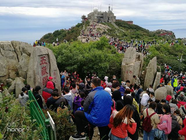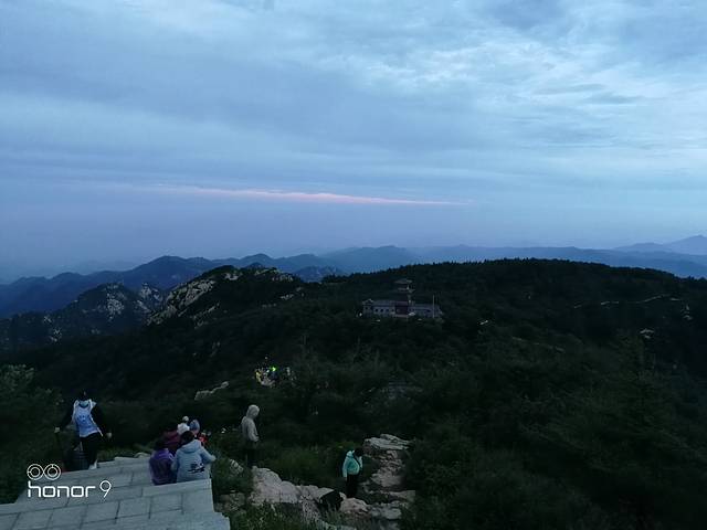 凌晨4:10分宾馆老板就催大家起床,匆匆洗漱一番,发现满宾馆楼道、街道屋檐下都是打地铺的游客,暗自庆幸。5:00出门时天依旧黑黢黢的。清风悠悠,灯火隐约,人却渐汇渐多,最后竟至摩肩接踵了。人流相簇相拥着爬陡履缓,行了大约十来分钟到达玉皇阁下边的一个观景台,那里已聚了不少的人。观景台上晨风很大,吹的人瑟瑟发抖,但为了一睹泰山日出的美景,强忍着。然而随着日出时间的临近,天边的云彩没有任何变化,希望不能如愿了。6:00左右有淡淡的红云出现,但太阳终究没有露面。于是我们再登玉皇顶,玉皇顶有玉皇庙,殿前有“极顶石”,傍边有“古登封台”碑刻。从玉皇顶看到每个观景台上人头攒动,人山人海,每条山道上人来人往 、川流不息,无数游人争先恐后地与“五岳独尊”刻字照相。站在玉皇顶上遥望苍茫的群山、俯察山下的城镇,一览众山小、山高我为峰,大山就在脚下,想想也十分美好。做了最后的告别观看后,我们选择从来时的路线回宾馆,这边的小路几乎没人。7:00回到宾馆,吃早点,休息。