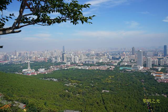 拾级而上,路两旁为石雕的十八罗汉,往前,就可以看到去万佛洞的岔路口有一巨大的石卧佛像。据介绍此为佛祖释迦摩尼的涅槃像,长10米,重50吨,于1996年落户千佛山 。我们右拐东行来到万佛洞,也许太早,也许.....大门关闭,未开放,我们前行右拐,登上高高的台阶,来到文昌阁前的石坊,从这里可以看到济南市区。接下来我们沿小路去了弥勒胜苑,看到了弥勒大肚佛,据介绍主体造像高20米,用3MM钢板锻造而成,花岗岩石质莲花宝座高9米,直径30米,有“江北第一大佛”之美誉。沿着松林间坡度比较大的石阶小路,我们到达卿雲轩,有“舜帝抚琴”雕像。继续沿公路向上,就到了历山院。从历山院向山下观望,可看到济南市区里高楼林立,景色看起来非常漂亮。简单参观后,我们未去兴国禅寺,而是沿着历山院门前陡峭的台阶,向上攀登,途中可看到不远处闪闪发光的金色弥勒大佛。经过清代诗人朱崇勋《九日登千佛山石刻》到达了赏菊阁,阁内并无菊可赏,只是一个登高远眺的亭子。继续沿着山脊上平铺的块状岩石,缓步向上,就登上了千佛山的最高点。山高人为峰!站在山顶远望,大明湖如镜,黄河如带,泉城景色一览无遗!好美啊!我们坐在大块的岩石上,尽情享受着迎面吹来的山风、享受着阳光、欣赏着美景,好惬意啊!