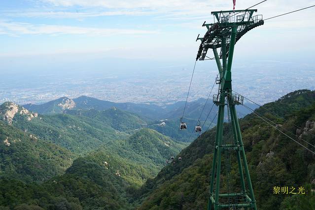 11:00我们结束参观,骑电动单车回宾馆,带了应急食品、水果、酸奶等,在宾馆前台寄存了行李,吃了饭。就向泰山进发,骑电动单车到天外村广场,13:20坐上每人30元的环山车,20多分钟后到了中天门,下车后步行大概10分钟左右到达索道站,乘每人100元的索道,14:10左右到达南天门索道站。从年青时我就想领略一下五岳独尊的泰山,今天,我的梦想终于要成真了!