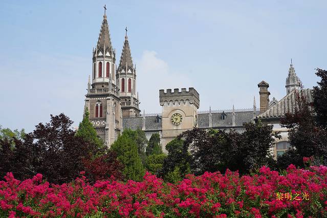 教堂西方建筑格外显眼,外观漂亮、大气,很有特色,感觉挺古老、挺神秘。隔壁是山东大学校园,从校门可以看到,校园内郁郁葱葱,环境很好,因疫情不让我们参观。旁边是一个广场,鲜花盛开,好多老人在健身。教堂大门紧闭,未开放,我们只好在大门前拍了几张相,在周围逛了逛后,坐公交去山东博物馆。