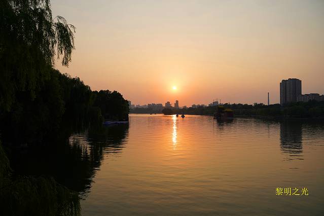当我们到达南丰桥时,夕阳从西边落下,落日余晖仿佛给天空涂上了一层金粉,将天边云彩染成了红色,绚丽的晚霞映红了湖面,落日的余晖,将柔柔的光洒在树木上,洒在曲桥亭台上,洒在荷花上,大明湖开始变得柔和,妩媚动人,湖面上水波粼粼,水天一色,格外好看,犹如一幅非常漂亮的美丽画卷。