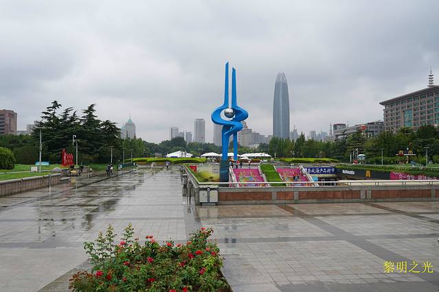 19:40逛完商场,雨也停了,空气也非常好,赶紧去看喷泉,人很多。圆形水池中,盛开着一朵巨大的金属荷花,周围有几朵小荷花当陪衬,当音乐响起,水自水池及荷花中喷射而出,形成大小无数个喷泉,喷泉随着灯光和音乐变换着体态,时高时低,最高的达数十米,十分壮观。广场上跳广场舞、锻炼的、训练的、唱歌的、抽陀螺的,人非常多,抬头天空中是各色闪亮的风筝,前面是玉泉森信酒店的黑人广告正朝你咧着嘴笑,后面是恒隆广场的一个个广告牌又缭乱了你的眼睛,这个时候,你往西方的天空一看,那有个圆圆长长的建筑在闪着光,高大的楼体上写着一句话“爱要大声说”。