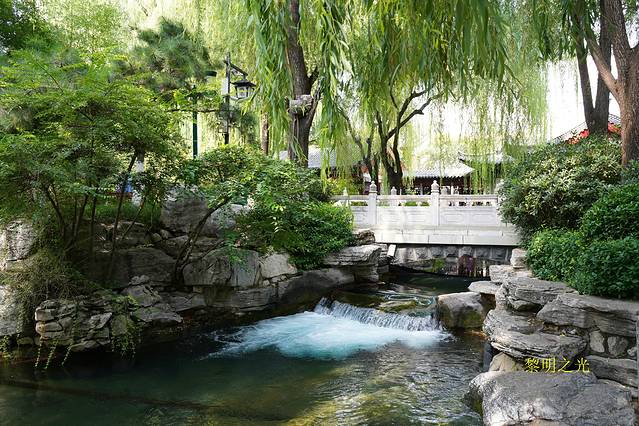 早晨,晨曦从窗户中射进来,惊醒了熟睡中的我们,太好了,太阳出来了,大晴天,顿时情绪振奋,赶紧起床,吃了早点。约7:30从北门进入了大名鼎鼎的趵突泉公园。门票每人20元。趵突泉公园是以泉水为主题的特色园林,被誉为“天下第一泉”位列济南“七十二名泉”之首。我们表现出一种逾于常情的迫不及待,几乎忽略了中间一些必须经过的环节,直奔目标趵突泉。三股泉水折冲翻腾,珠滚玉碎,澄澈清洌,泉边亭台环绕,杨柳依依,多少年的夙愿竟在眼前!让人满足、让人震撼、让人醉。也有一点疑惑,那块泉池中的石碑"趵突泉"三字,怎么"突"字宝盖上少了一点呢?有一种说法是,泉水激射,把上面的那一点掀掉了,这种说辞多半属于一个美丽的杜撰,真正的原因可能得从书法的角度寻找。尽情后,开始逐一欣赏构成趵突泉泉群的无忧泉、金线泉、漱玉泉、马跑泉、杜康泉、白龙泉等许多个名泉。公园里曲桥流水,亭台楼榭、叠石假山、绿植满眼,颇有江南园林景致,池子里大大小小的泉眼争相喷发,碧水奔涌,更有许多小瀑布,形式多种多样,煞是壮观。公园内建有济南惨案纪念堂、泉水自然地理博物馆、李清照纪念堂、李攀龙纪念馆(白雪楼)、王雪涛纪念馆、李苦禅纪念馆等。各种题字都出自名手,毕竟是历史悠久的佳胜之地。还有万竹园、沧园等,绿植遍布庭院,很养眼。当然找个清凉之地,心静神凝,百事无扰,坐望坐听泉水流淌之形与声,是何等的享受,又有几许人可以领略得到呢?