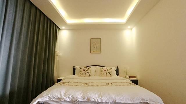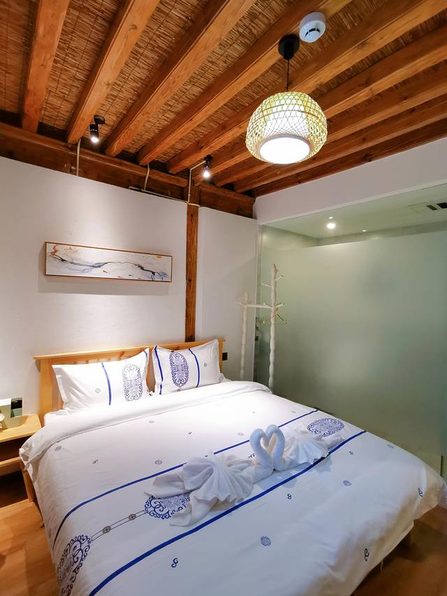 喜洲古镇里面,近百年的白族传统四合院建筑,院内带有白族照壁,还种植了很多多肉绿植,房内白墙木顶,多用淡蓝色点缀,竹藤主灯+木色的床椅装饰效果很棒。