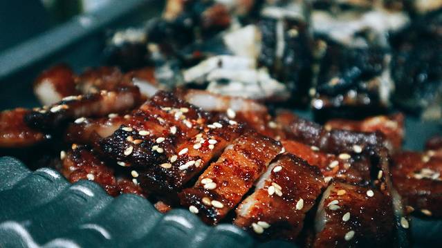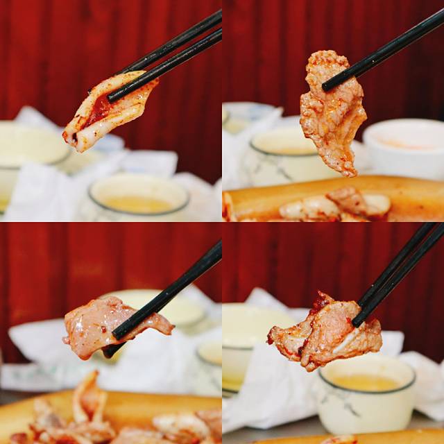 五花肉烤的焦香四溢,光闻着就想流口水,一般是用少许生菜包着,蘸上酸辣酱一口蒙,口味适中,一点都不腻!