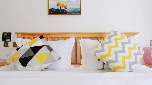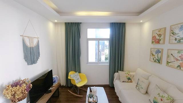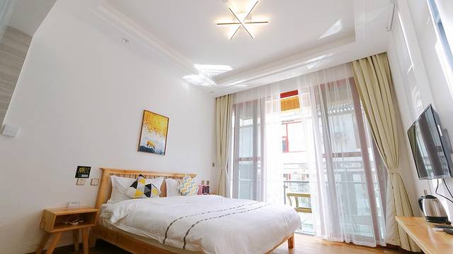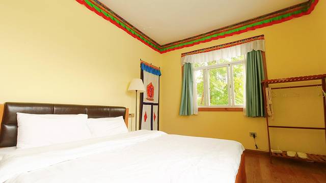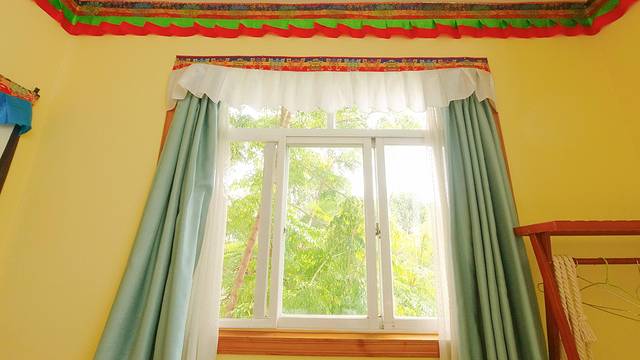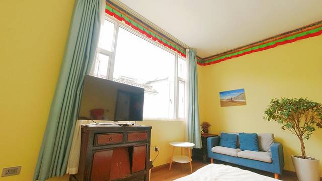 进入房间,淡黄色的墙面很是温馨,如果我没有猜错,房间的装修带了一些藏式元素。房间有两个大窗户,使阳光充分的进入,房间内的电视柜,沙发角柜看起来有些年头了,也不知房东是从哪里淘来的,真的很有味道。