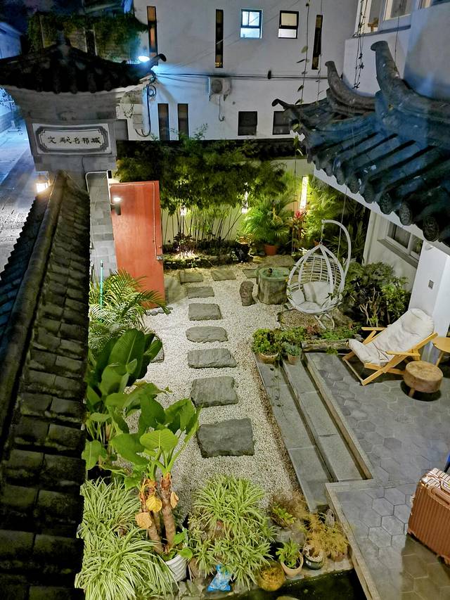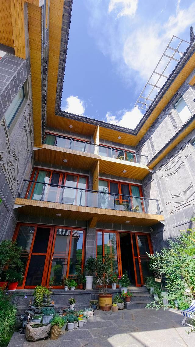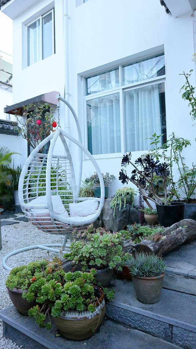 住在大山上的海景客栈,白族特色建筑,青瓦白墙,一个大大的小院子里种了很多的多肉植物,还有假山景观、悠闲躺椅,非常有生活品质的小院子!