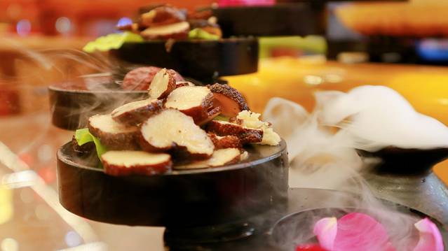 白族特色石板烧最大的特色就是用一块石板。,把食材放到上面煎烤。