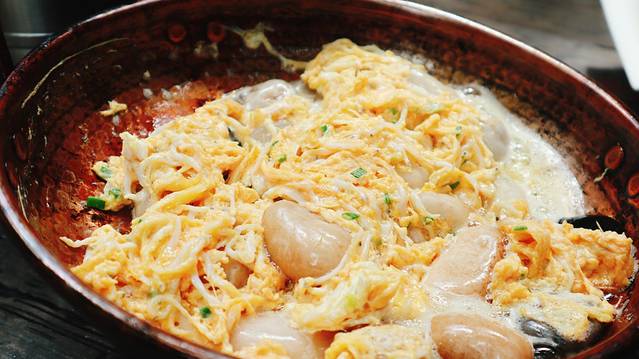 铜锅里面装着滚烫的石头,把银鱼和鸡蛋打在一起,沿着碗边慢慢的溜下去,均匀的铺在滚烫的石头上,伴随着一身刺啦刺啦的响声,这道菜就可以吃了,刚吃的时候口感比较软嫩,鸡蛋的味道让银鱼的鲜味提升了一个档次,相当不错!