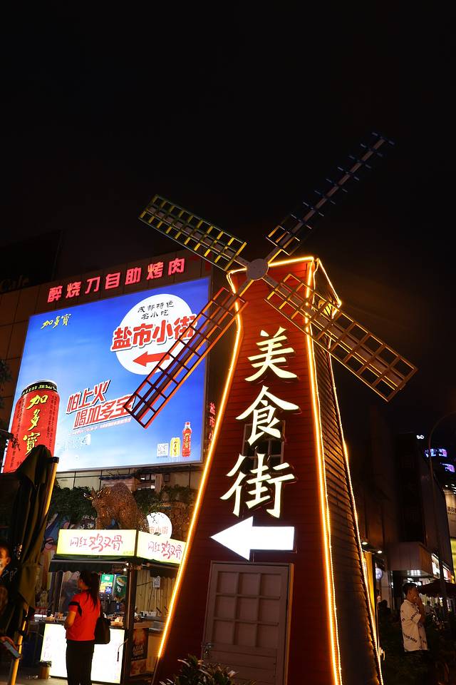 这条美食街位置很好,就在市中心的春熙路附近。它很年轻,年初才开始运营。门口的地标大风车,远远就能看到,很好找。