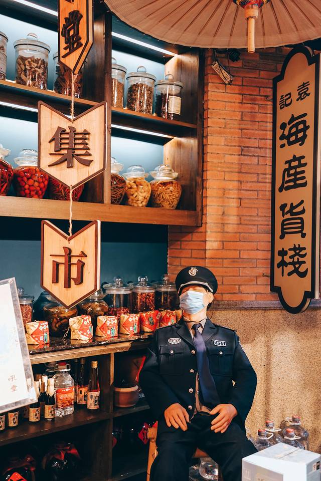 整个店铺的装修运用了很多民国元素,撞色搭配也非常大胆。
