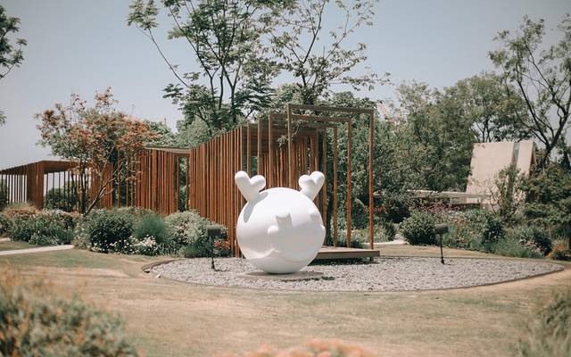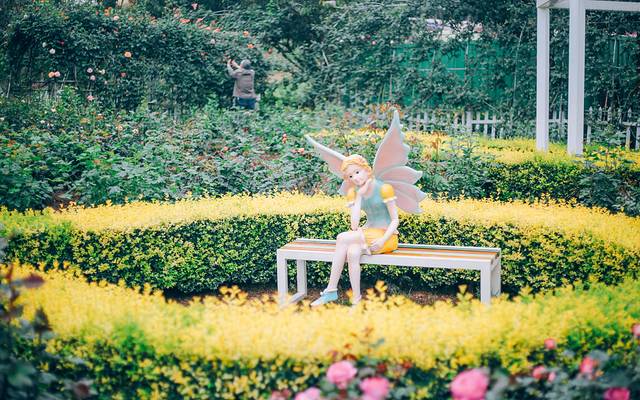 百年玫瑰树区域里,金色玫瑰雕塑一定是最吸睛的部分。拾级而上时,经过的“钢琴键”楼梯,