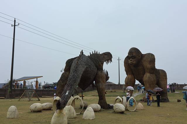 花海的旁边是“稻梦空间”,里面都是用稻草制作的模型,最大最经典就是大恐龙和金刚。还是那句话,天气不好啊!