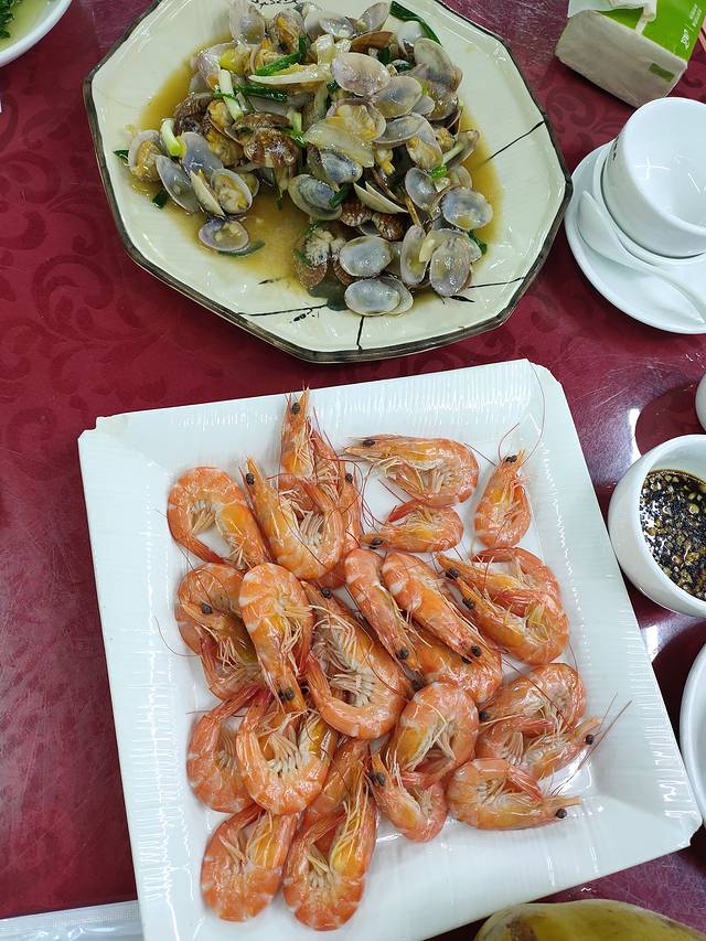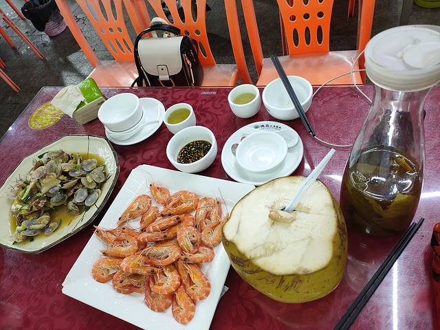 5km内免费接送,预约后提前就在民宿等我们,很省心。我们吃了丰盛的海鲜大餐,有虾,花甲,鱼,扇贝,菜和汤,vip还送了椰青,分量超级足,鱼蒸的很鲜甜,嫩滑嫩滑的。花甲也很鲜甜,扇贝很新鲜,虾分量太足了,都没吃完,朋友说番薯叶很好吃。4个人吃的好饱好满足。吃完老板还开车送我们回民宿。路上聊天了解到他学厨3年,做了7年厨师长,之后开餐馆,还到全国各地品味不同的美食,回来提升饭店的味道和服务,真是把爱好当事业了。
