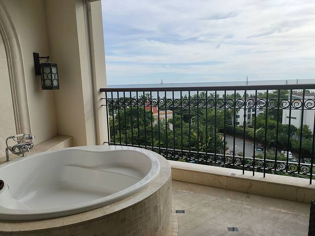 阳台的是按摩浴缸,造型时尚,泡着浴缸看着海景,享受满分。