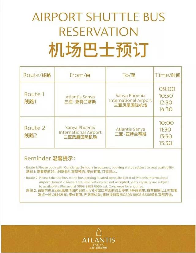 三亚湾oneday木筑到海棠湾亚特兰蒂斯酒店大概1小时车程,打车150元。由于oneday木筑有送机,接下来入住的亚特兰蒂斯有免费机场——酒店穿梭巴,我们午饭后check out,让民宿送到机场6号门,并搭乘机场的穿梭巴到亚特兰蒂斯,省了150元,而且省事,不累。附上亚特兰蒂斯穿梭巴时刻表。
