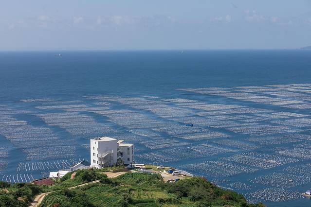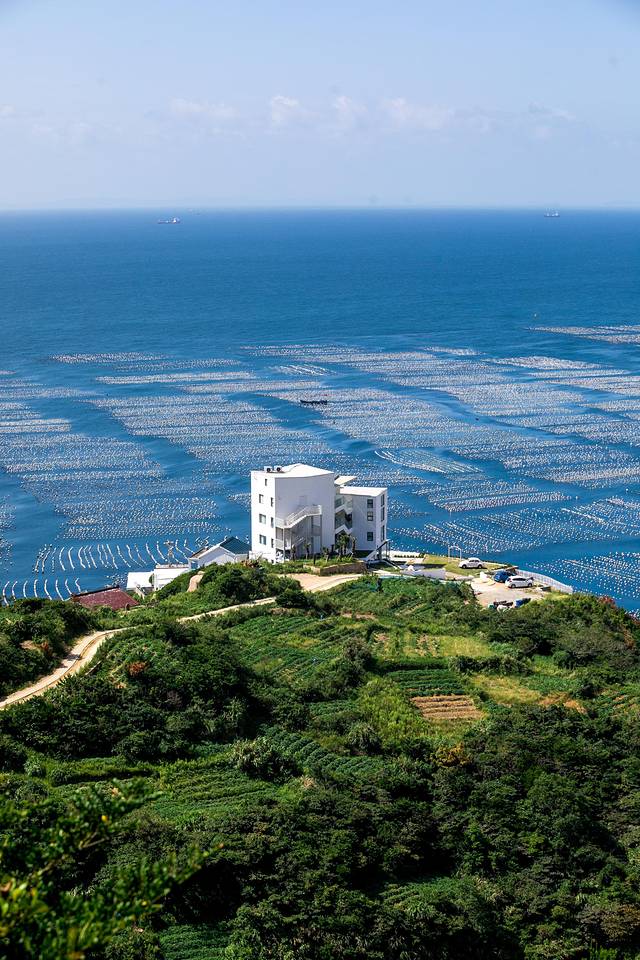 登上峰顶,居高临下,山、礁、滩、云、天、海,白色浮子,渔船,最美的海上牧场图尽收眼底。