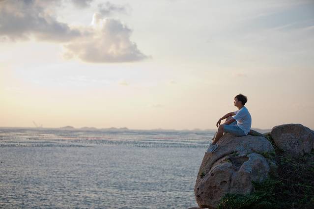 我站在崖顶上看海,可以看到海上的许多小岛,和在海滩上看到的景色完全不同。
