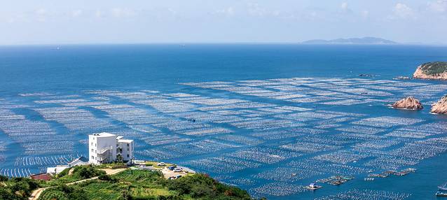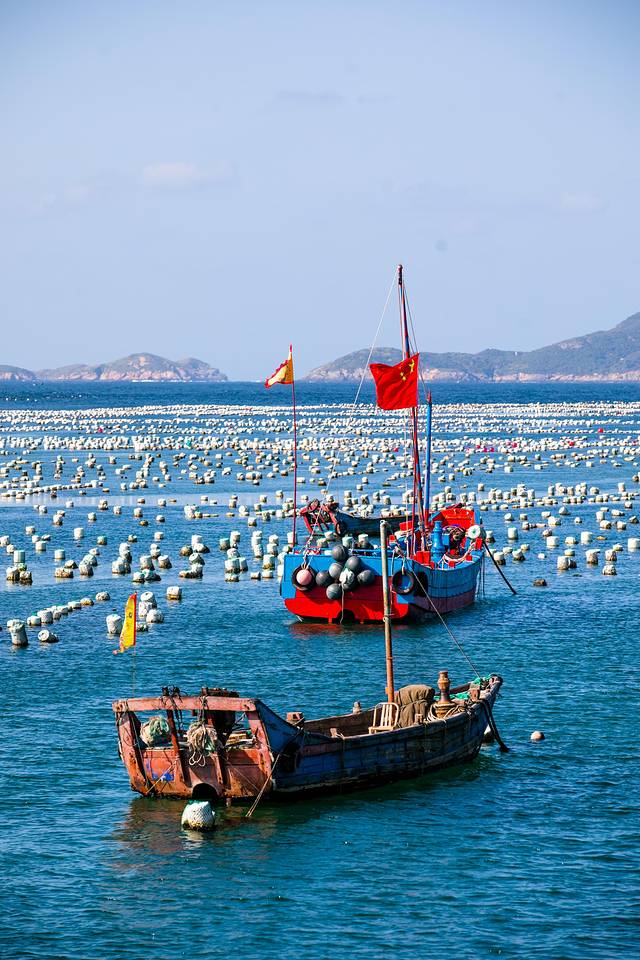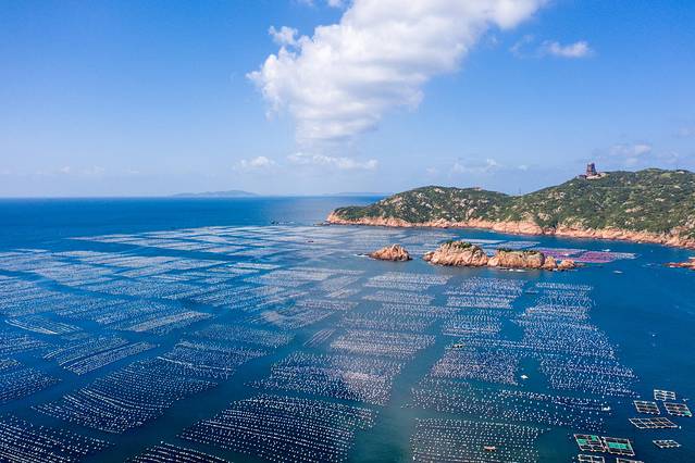 蔚蓝的大海在太阳的映照下水天相连、更显波澜壮阔。养殖贻贝的白色浮子在阳光照耀下闪烁着点点银光,渔舟在碧波荡漾中穿梭,构成了一幅美丽的海上牧场图。