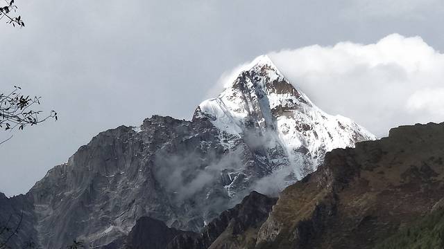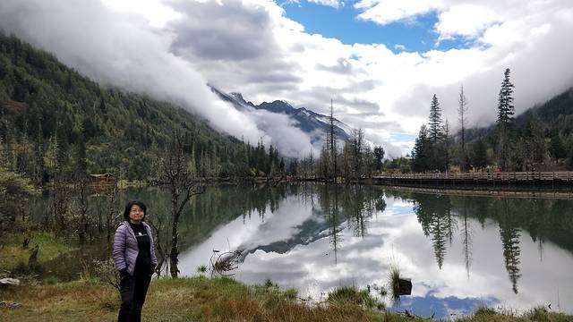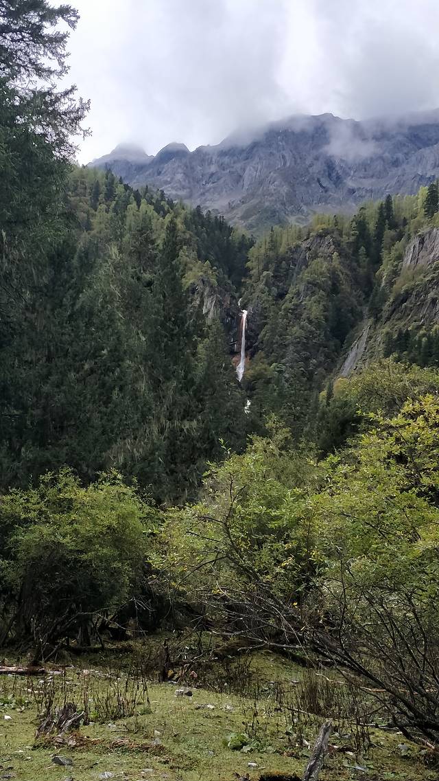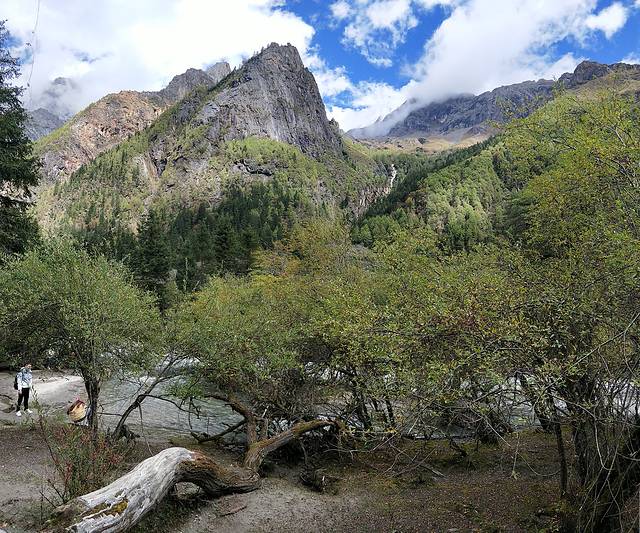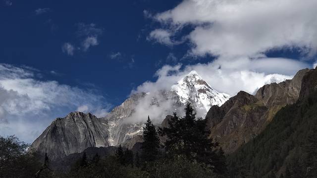 沟里上午多云流飘动,所以幺妹峰总是羞答答遮面看不到,此时下午四点左右,云少了,幺妹峰终于揭开面纱,让我们惊叹她的姿容了。