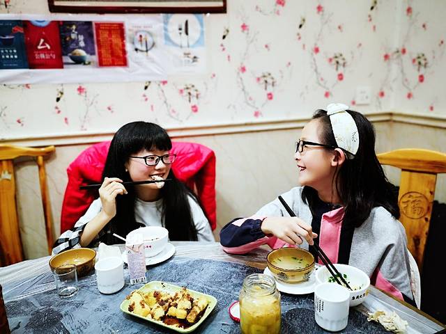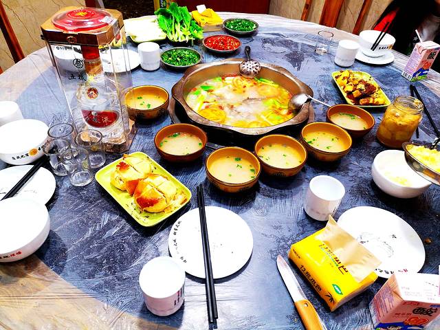 因为今天是个家国两团圆的好日子,我们找了一家牦牛肉汤馆晚餐。适逢节假日,餐馆的生意爆满,在排了二三十分钟的队后终于轮到我们了,因为等待时间稍长,老板娘很耿直的送了我们几个素菜,两个小朋友一人送了一瓶酸奶。很难得一家人在外一起过节,所以我们小酌了一点。。哈哈。。