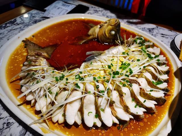 待雨稍小,天也黑了,步行街上人还是挺多的,下雨不方便也没能阻挡大家出门的心啊~就是夜市感觉没起来,看了看都是买衣服啥的,就直接某众dp找了家高分湖北菜馆 融厨·湖北菜铫子藕汤 品尝了有名的武昌鱼和排骨藕汤。这个店的排骨藕汤真的不太可,藕没毛病粉粉糯糯,排骨没炖烂也能接受,但是这汤上面糊了一层巨厚的明油,黄的不行,太可怕了根本下不了口,藕盛出来都要涮个水。