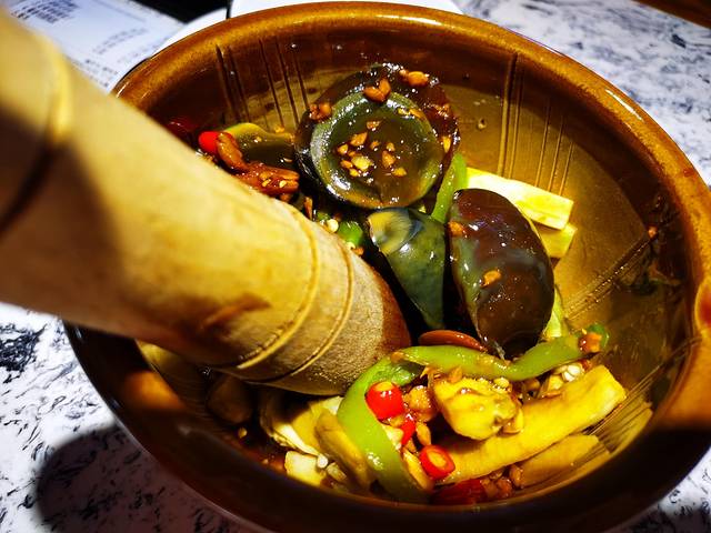 还点了一个 皮蛋青椒擂茄子 自己用木锤子擂,还挺有意思的,味道也好~