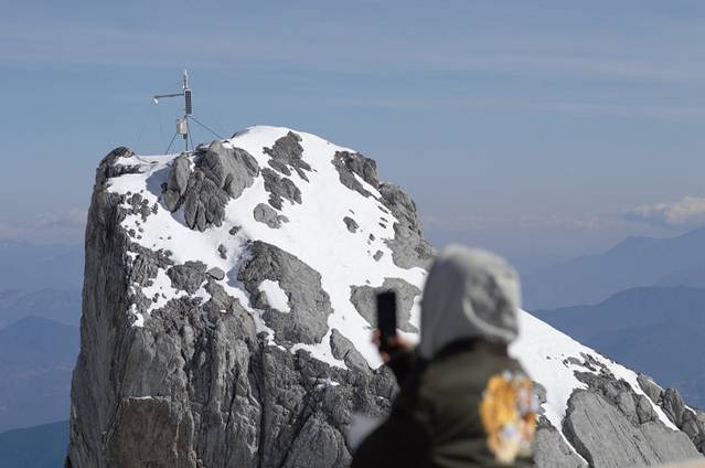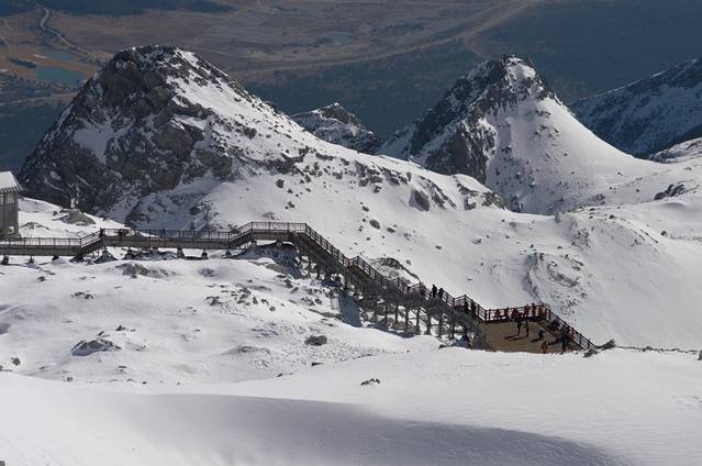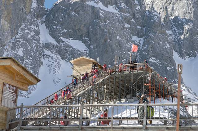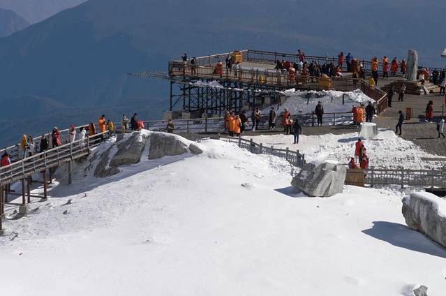 从踏上台阶开始,就可以看到图中那鲜艳的五星红旗,那里就是 玉龙雪山 所能到的最高海拔4680米,虽然距起点海拔4506米。仅有不到200米的海拔,但是300多米的步行距离,对身体也是个不小的考验。
