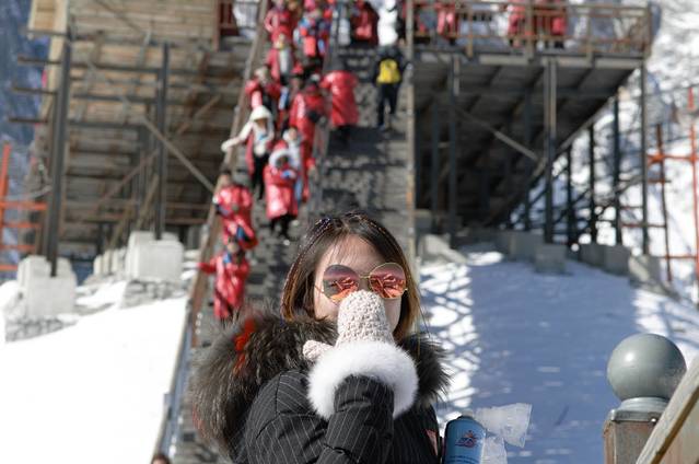 感叹大自然的鬼斧神工的同时,不得不感叹现代人的“丧心病狂”,到达终点前的楼梯居然是整个过程最长的88米,完全不顾此时的游客早已魂不附体……此时女友完全不是用飞吻诱惑我,而是用手套掩盖对我身体虚弱的嘲笑。(不得不感叹岁月催人老啊,3年前在4700米+的 纳木错 ,早起登山看日出的青年,今何在啊。)