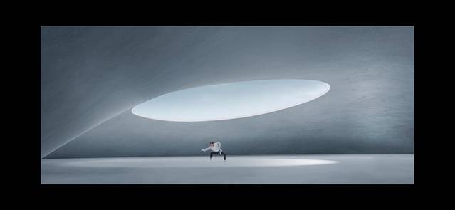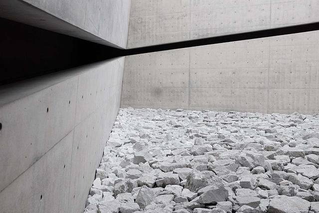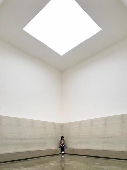 是不是感觉很单调?没错,整个美术馆的内容就是这么苍白。可我真的还蛮喜欢这个地方的。美术馆里有什么呢?只有顶上两个大洞。但是当你席地而坐,望天,看风吹草动,云卷云舒。低头,你会发现时不时有小水滴从地底冒出来,然后沿着地面微微的斜度,毫无规律的往周围的洼地流去。途中可能和其他小水滴相遇变成大水滴,然后又遇上其他大水滴慢慢变成小细流,最后融进稍大的水塘。也有可能因为动力不足孤独的停在地面某处,等待其他水滴某时某刻来救赎它。这个看水滴的过程就像小时候看蚂蚁搬家一样,很无聊,但能孜孜不倦的看很久很久…内心平静…