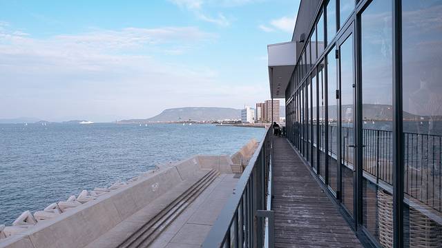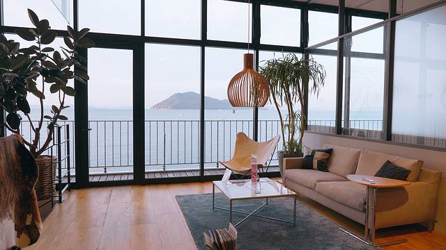 落地窗外有一条长长的阳台走廊,走廊的尽头还有些露天的座位。不冷不热的日子,这些座位可是很吃香的。海面上除了来来往往的普通船只,还有些帆船,应该是什么水上活动或者比赛之类的吧。站在阳台上,看着没有尽头的湛蓝,闻着空气中海风的味道。还有什么能比这样的午后更惬意呢。