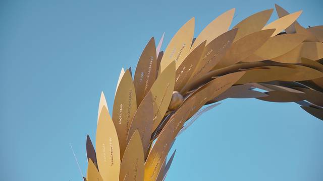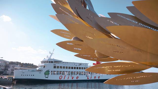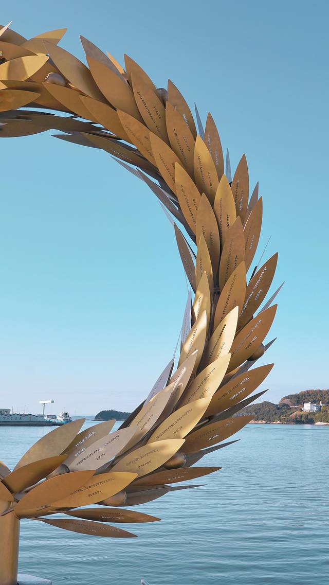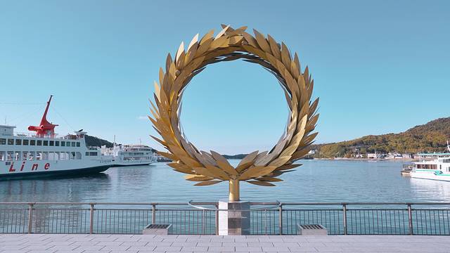 一下船就能看到码头边的第一件艺术品“太阳的赠礼”,这金灿灿的橄榄叶惹眼极了。
